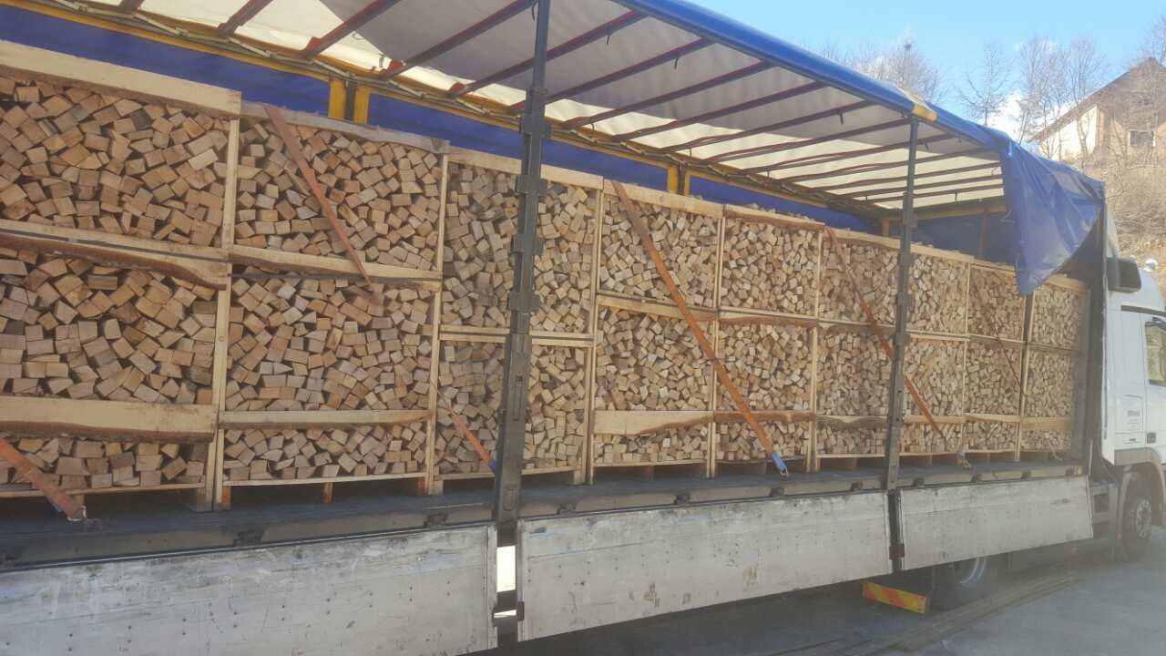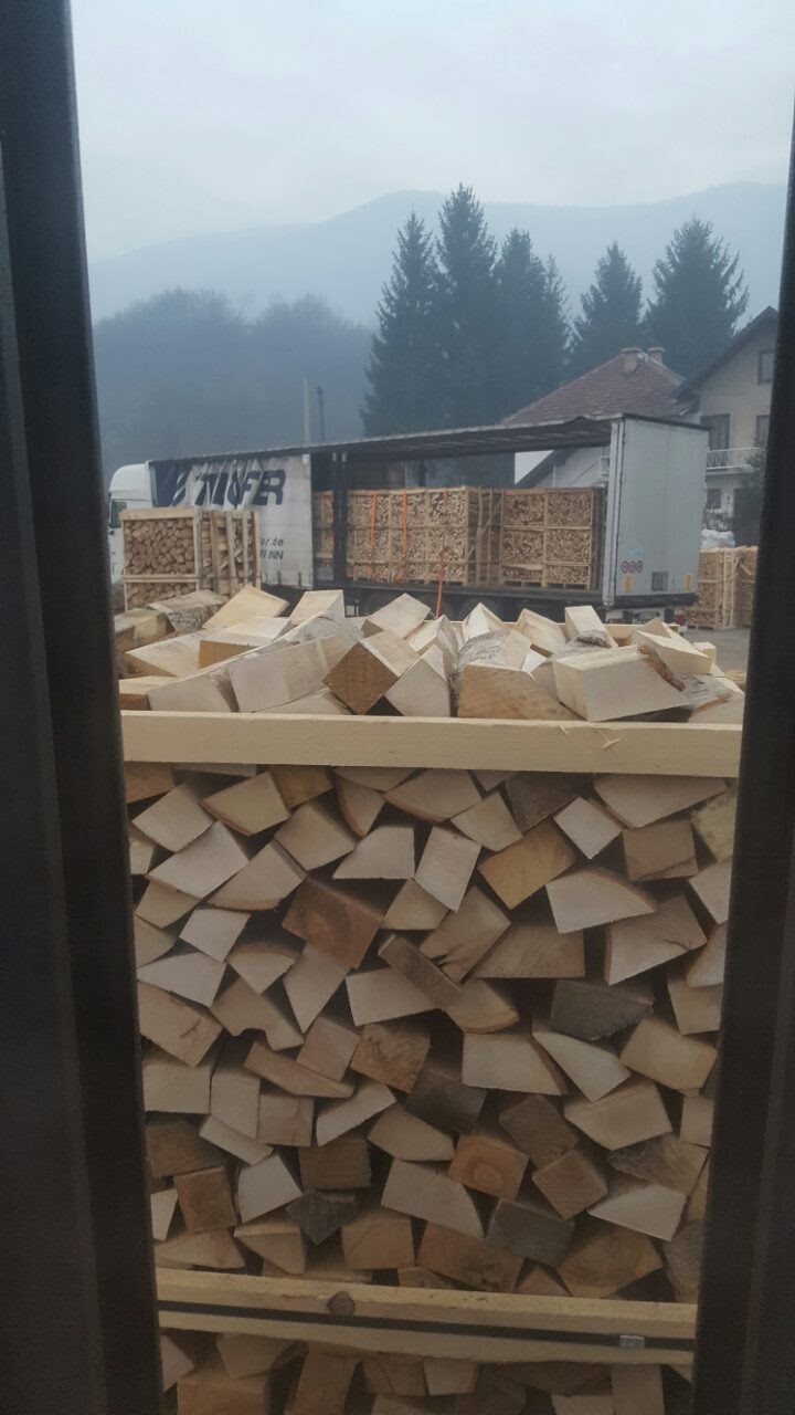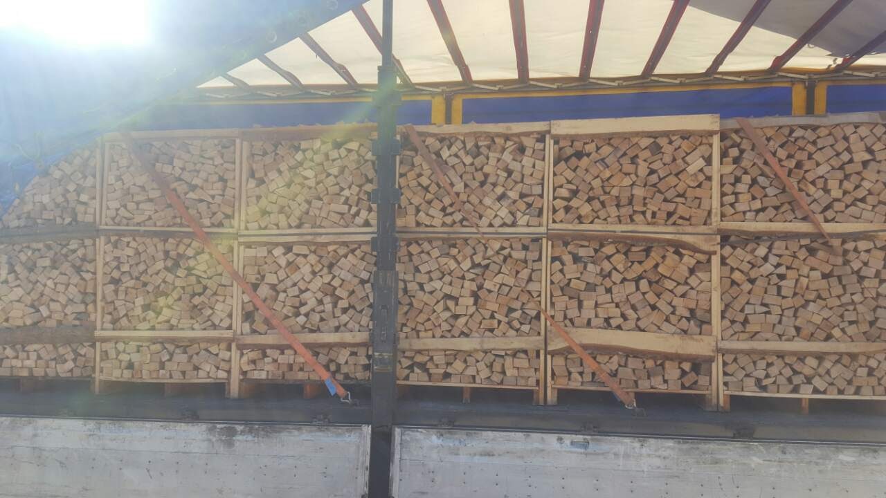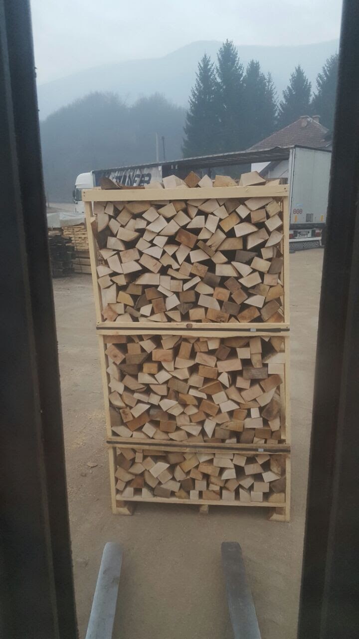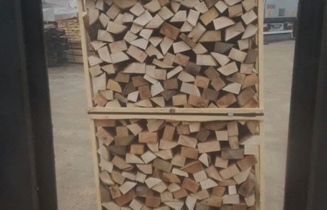 As seen on the picture, the firewood is being packed into boxes with outer dimensions 100x100x180 cm and they contain around 1,7 stcm (stacked cubic meter) of wood. The Boxes can easily be handled with forklift trucks. Because the wood is dry, the boxes are not heavy.